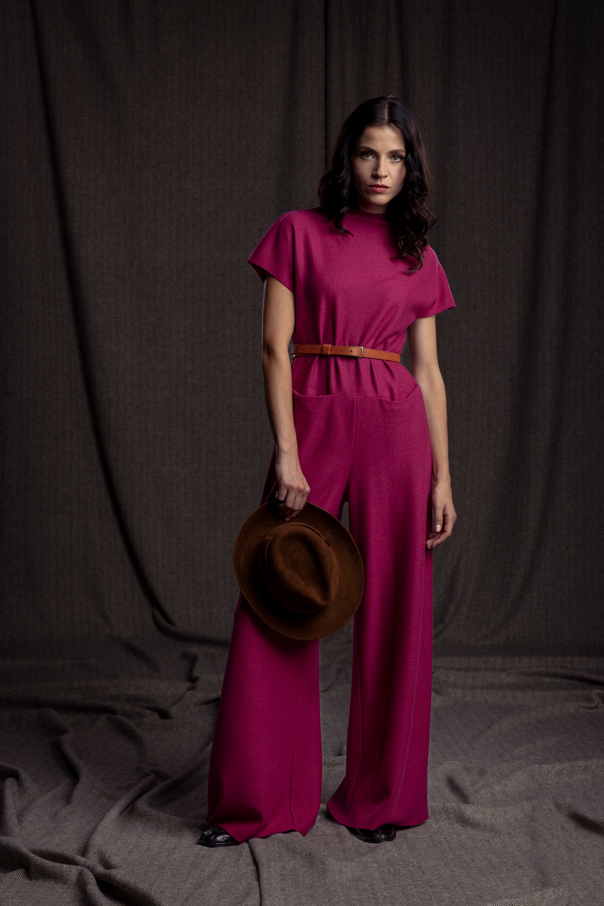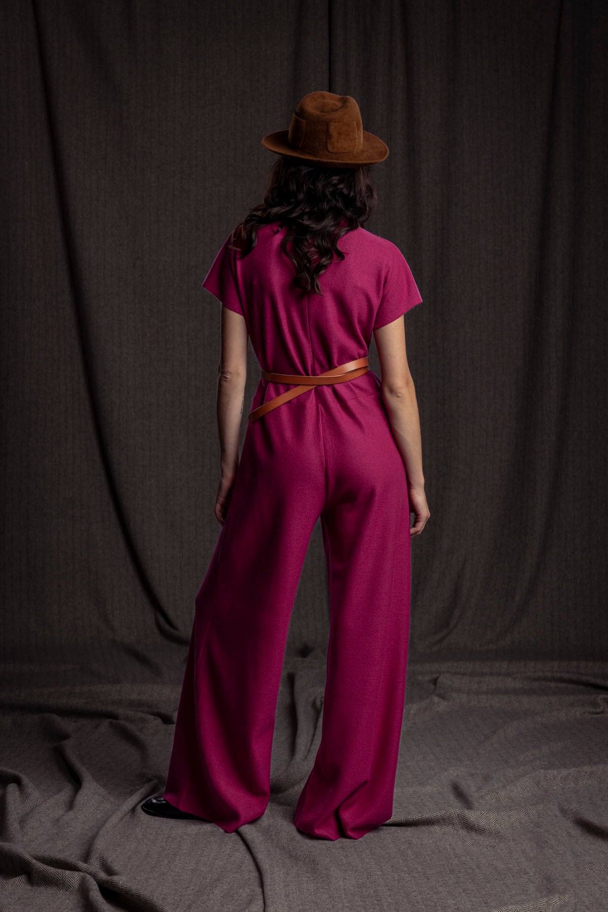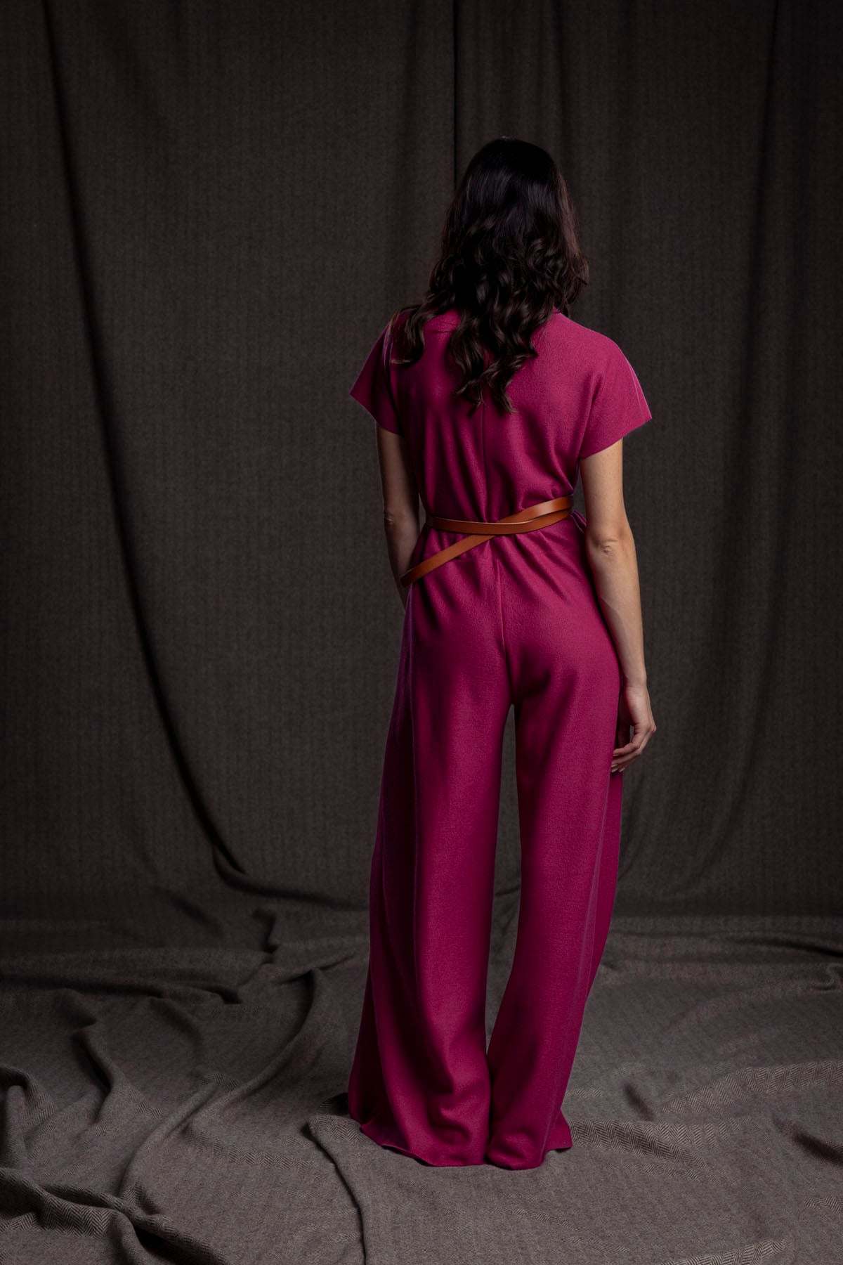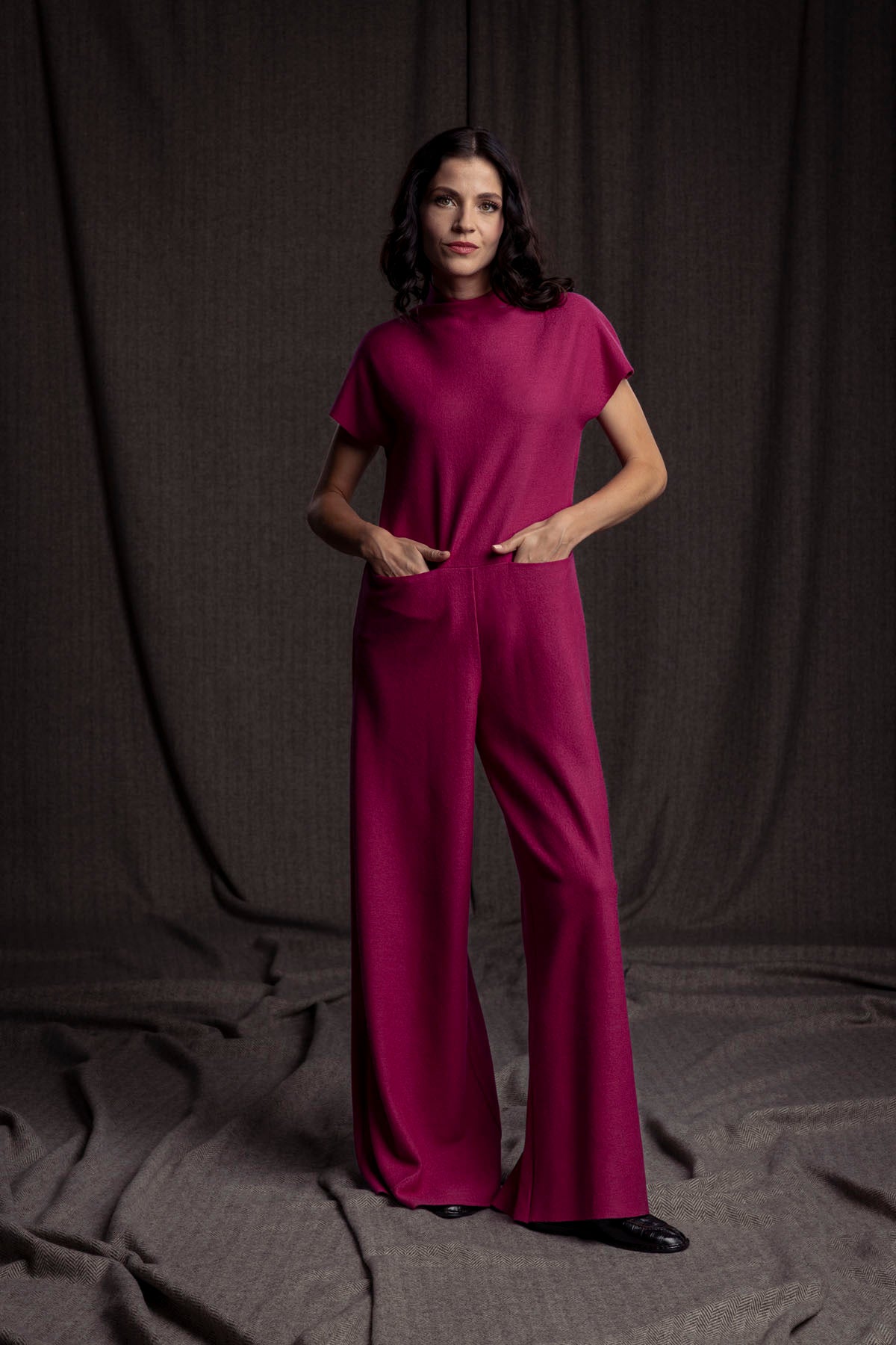 Eleganter Jumpsuit aus hochwertigem Merino-Walk, mit angeschnittenem Stehkragen, Nahtzipp im oberen Rücken und Taschen im Vorderteil.