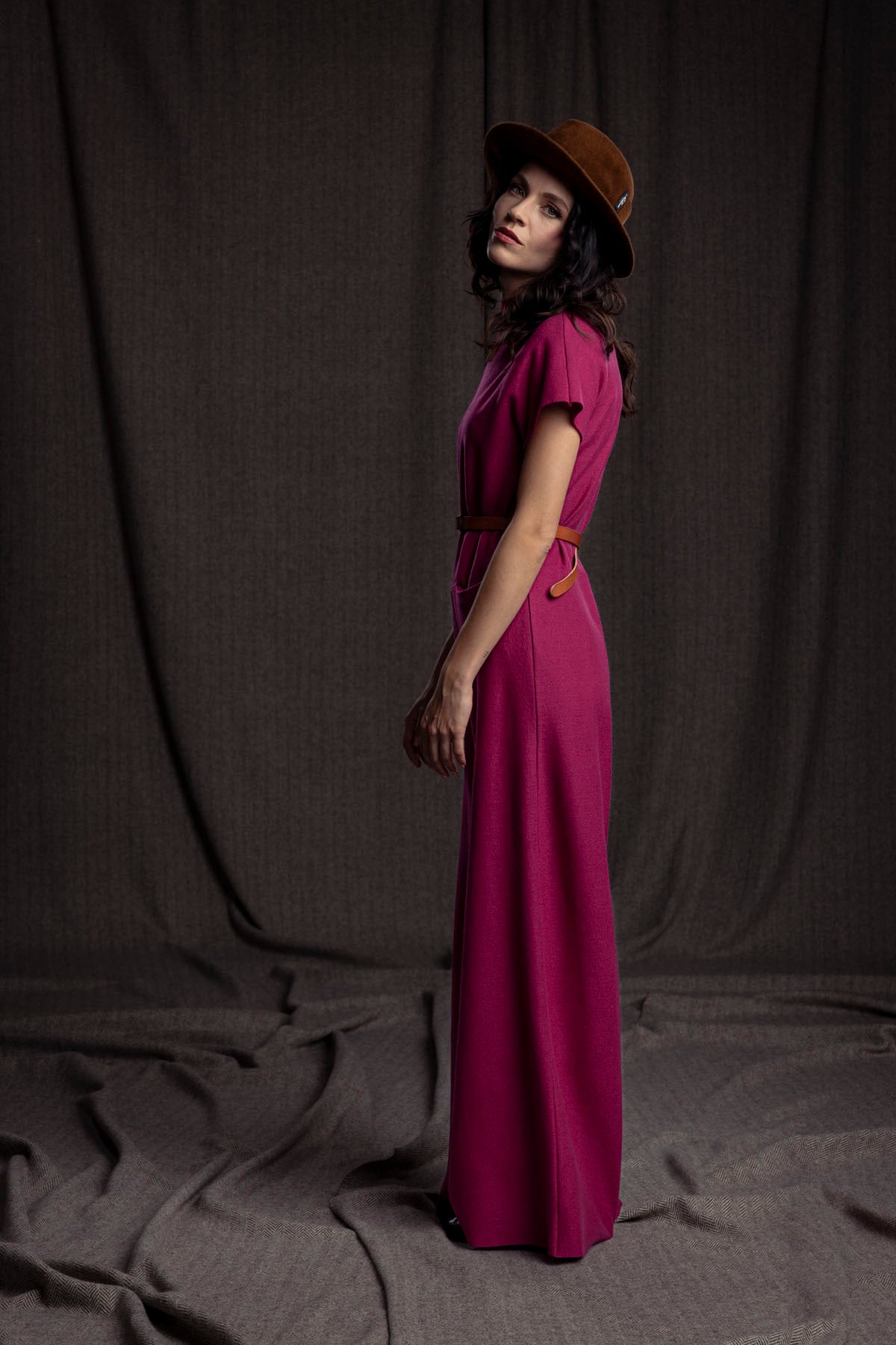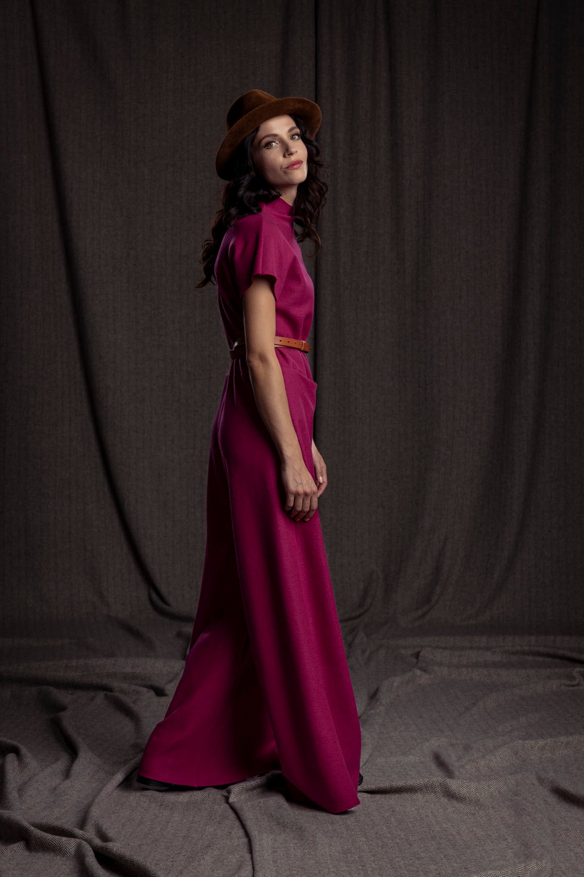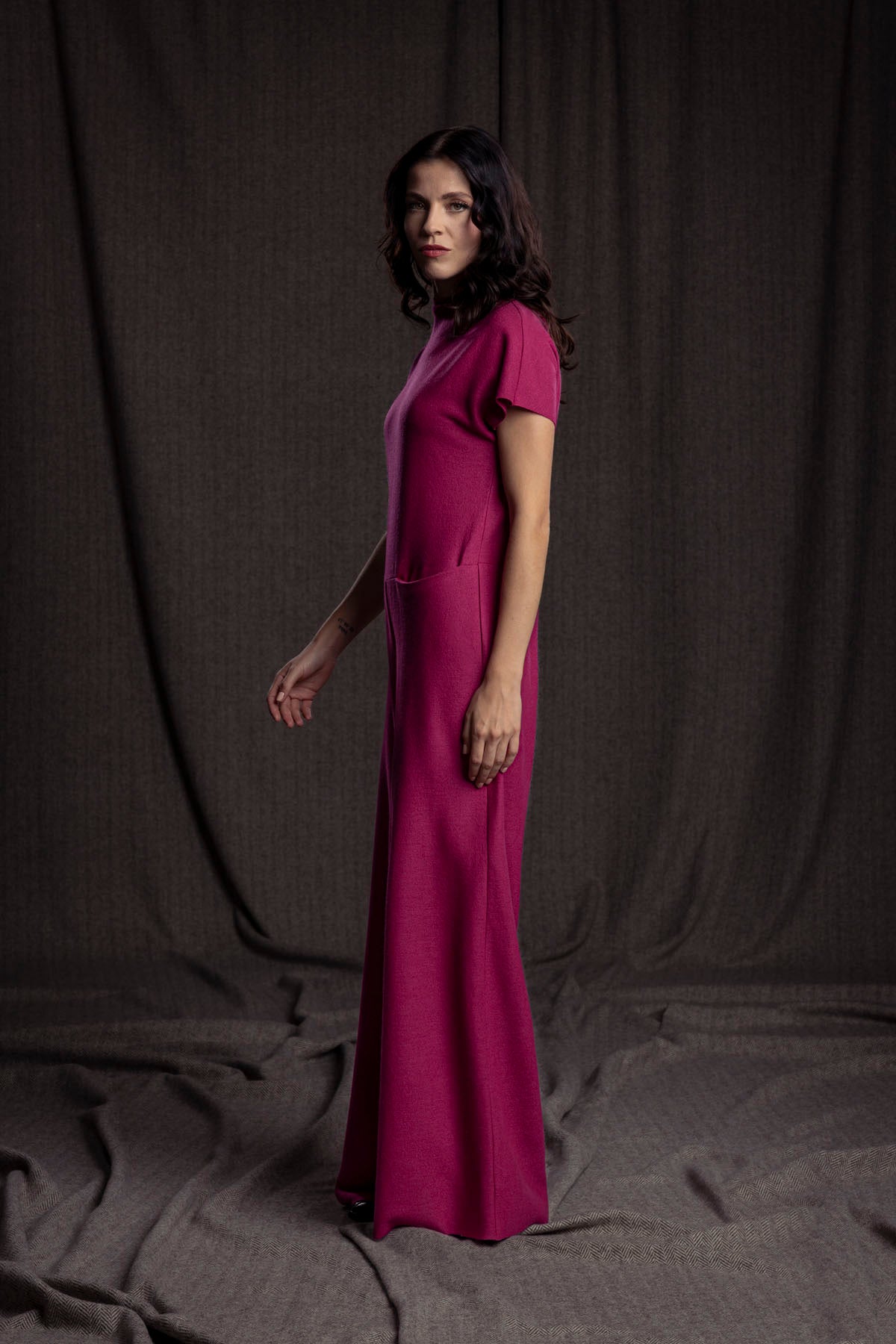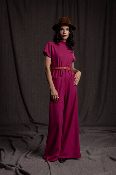 Eleganter Jumpsuit aus hochwertigem Merino-Walk, mit angeschnittenem Stehkragen, Nahtzipp im oberen Rücken und Taschen im Vorderteil.