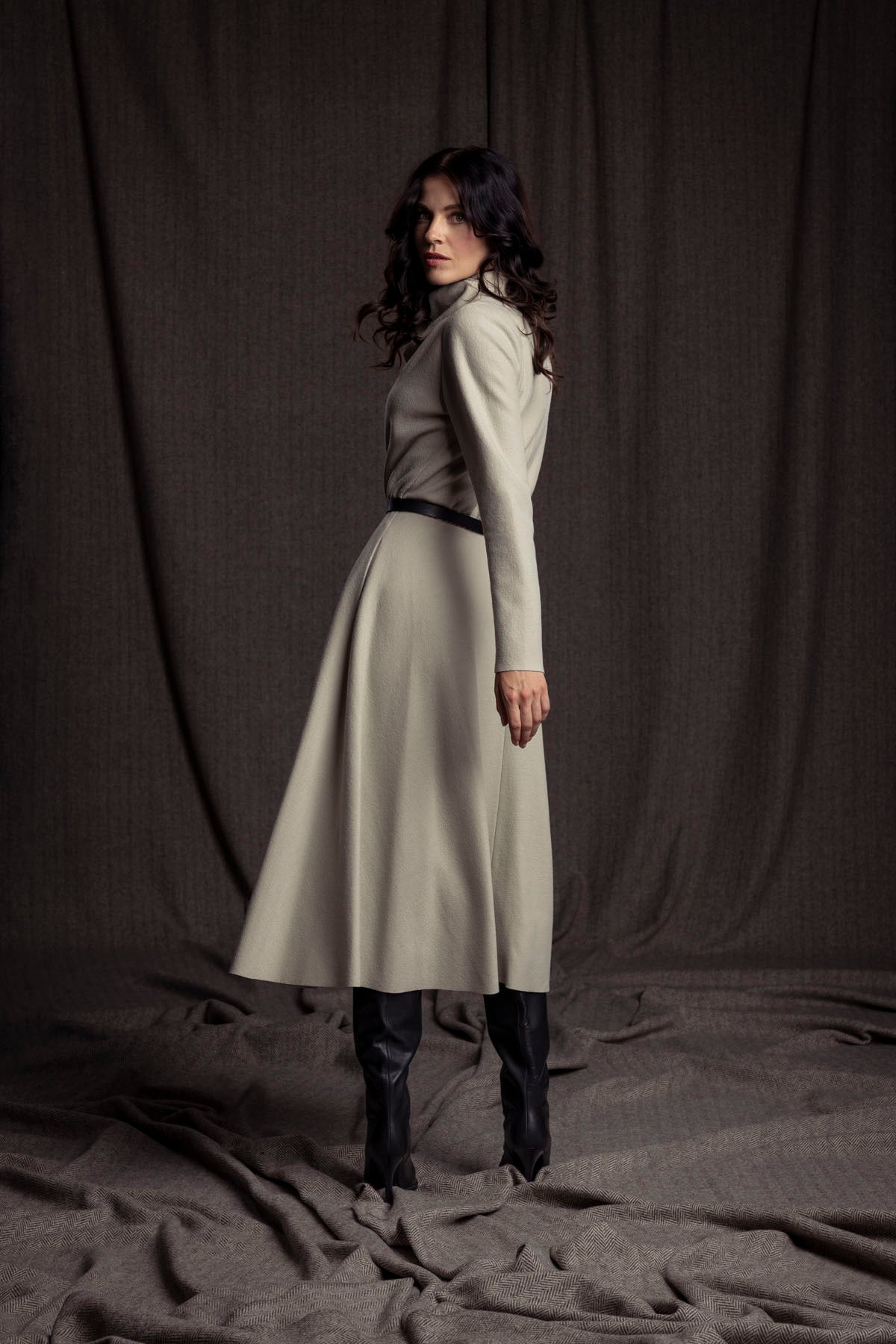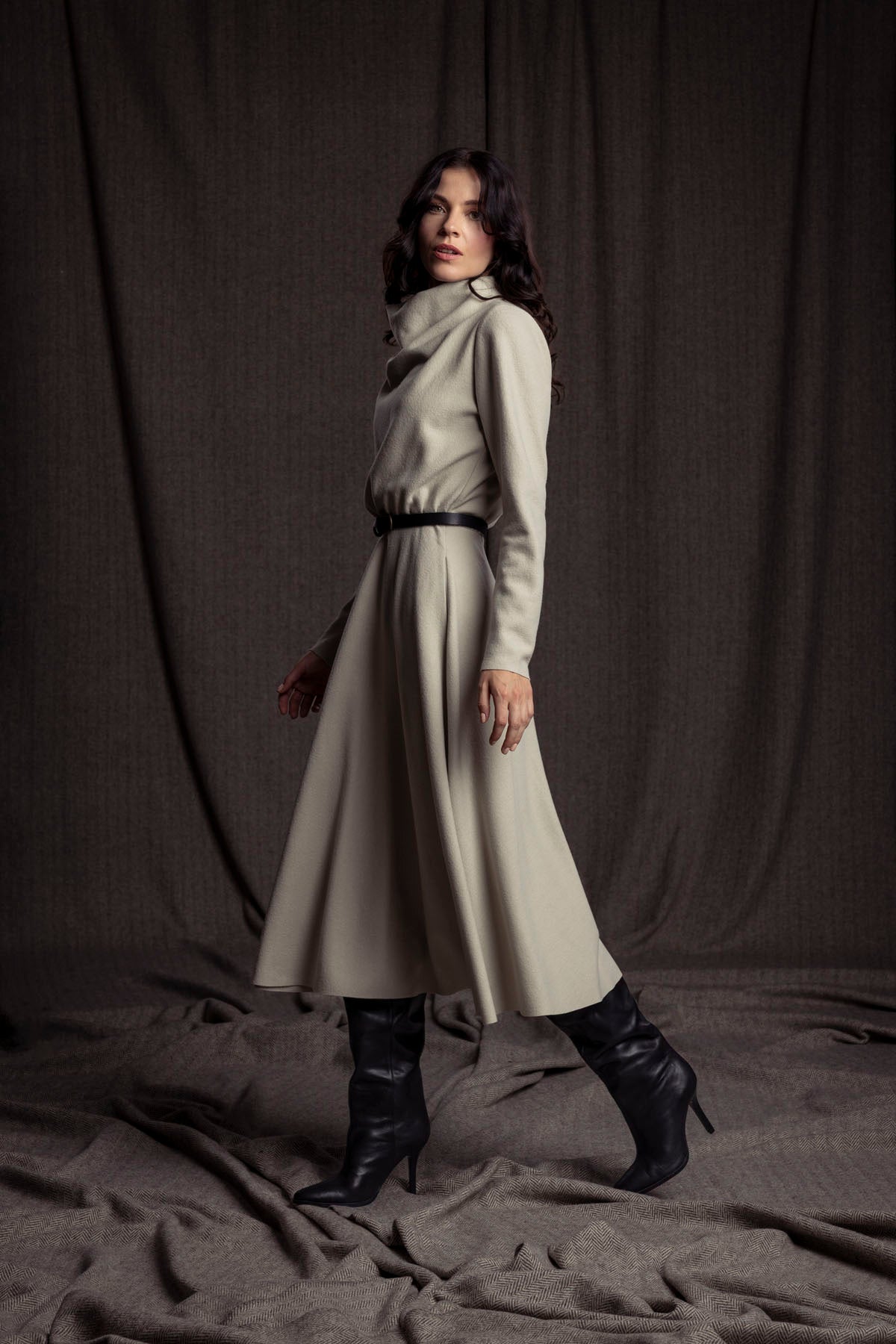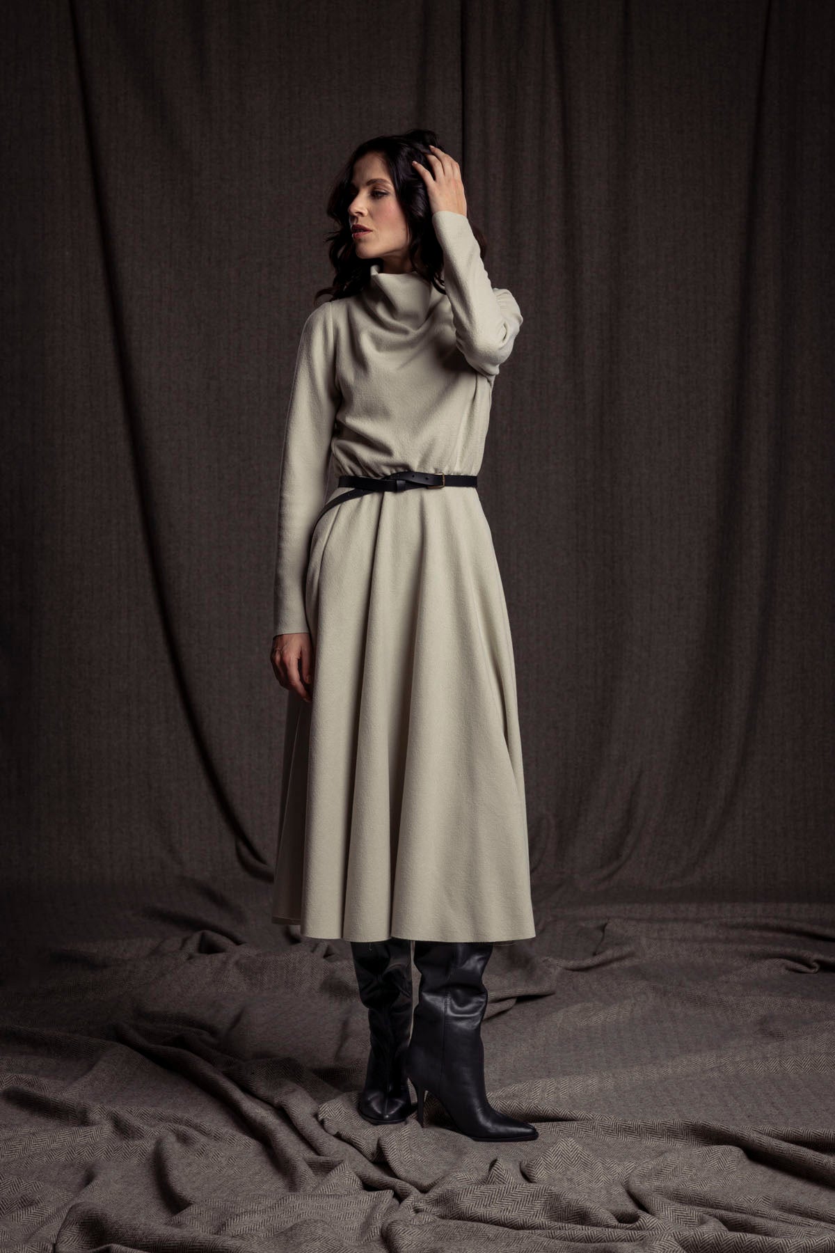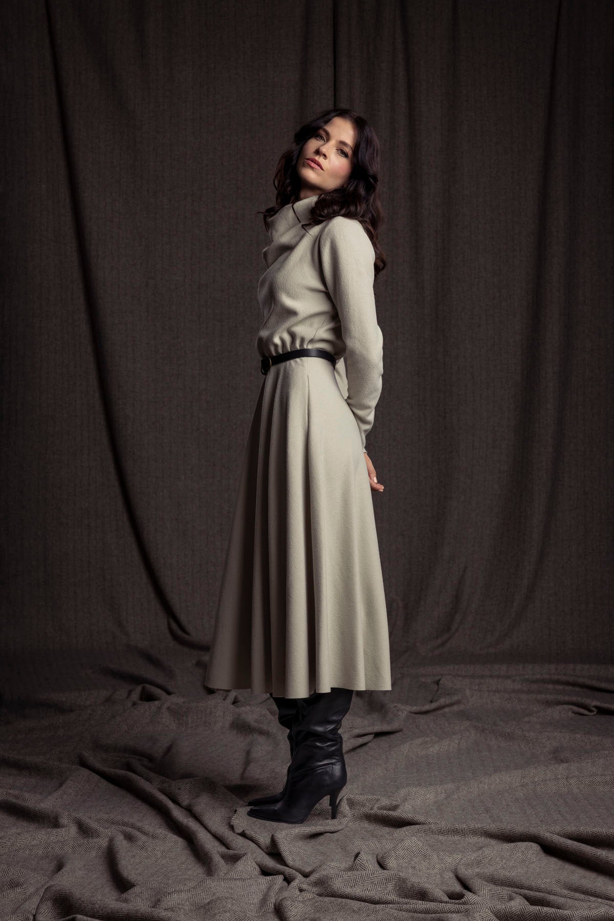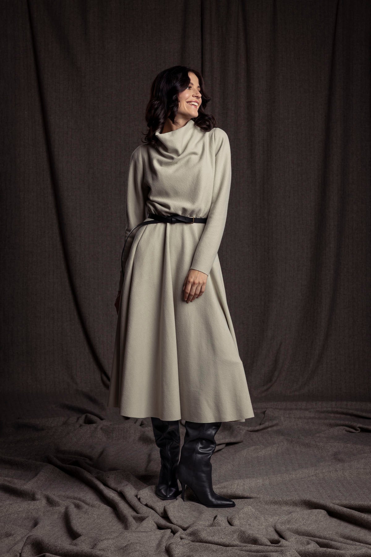 Elegantes Wollkleid mit Wasserfallkragen, Gummi in der Taillennaht und weit schwingendem Rock mit Nahttaschen.