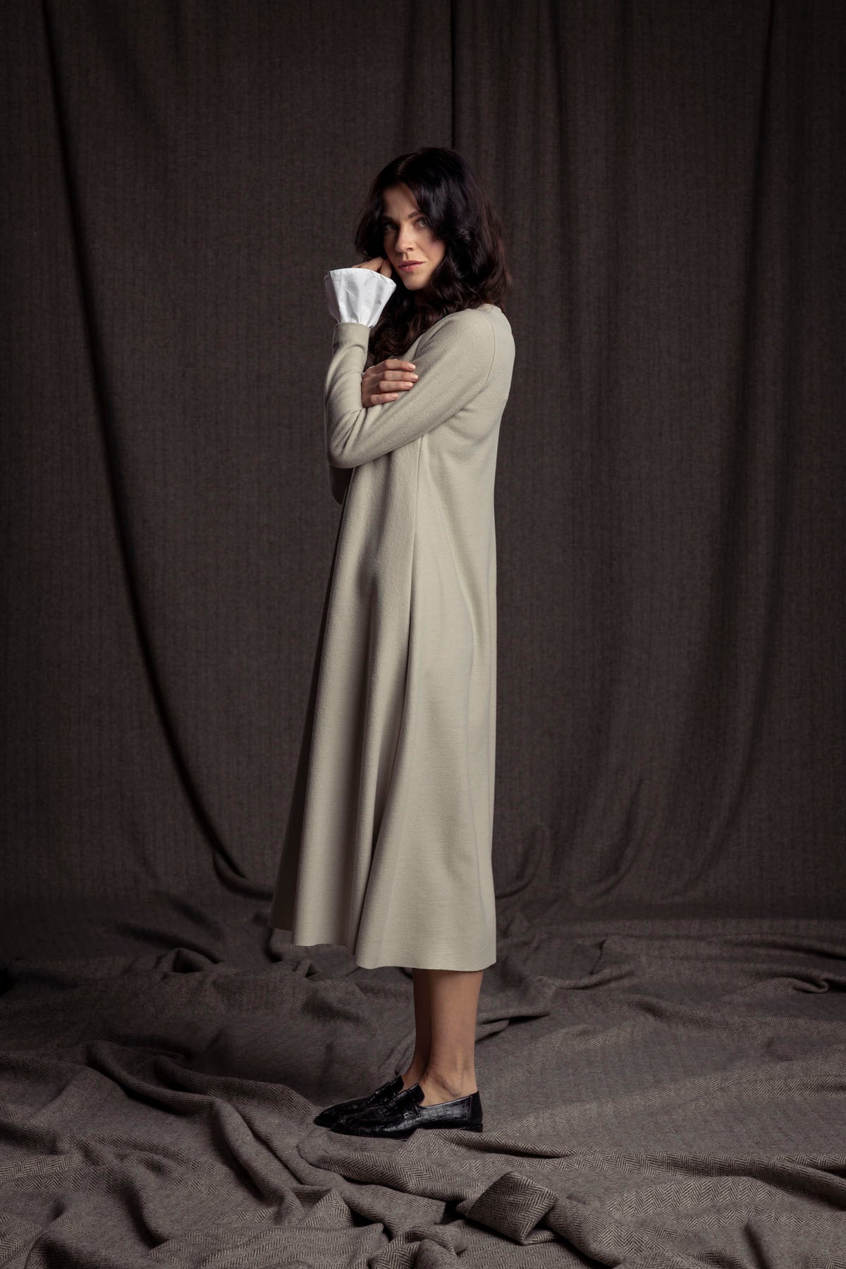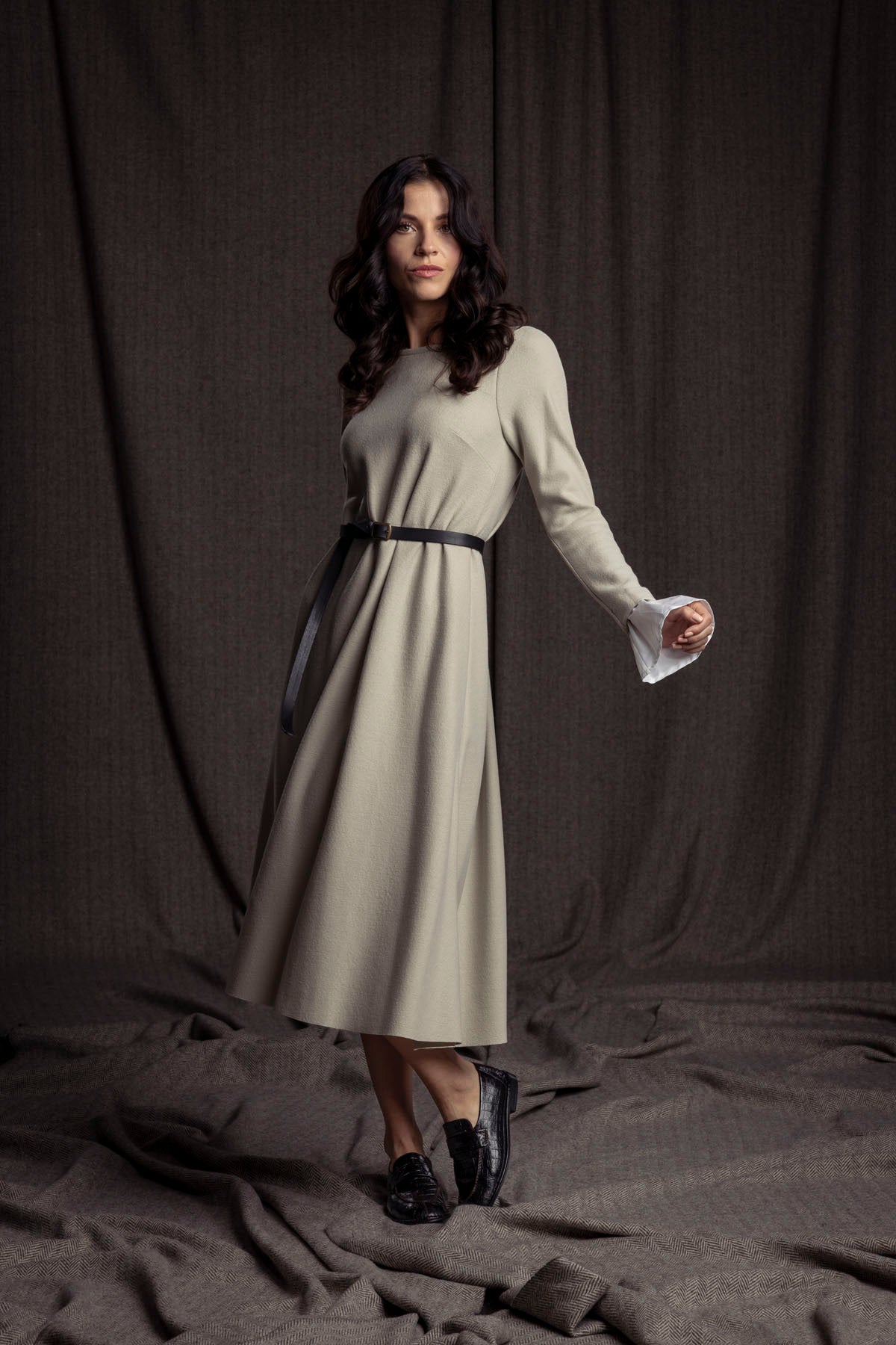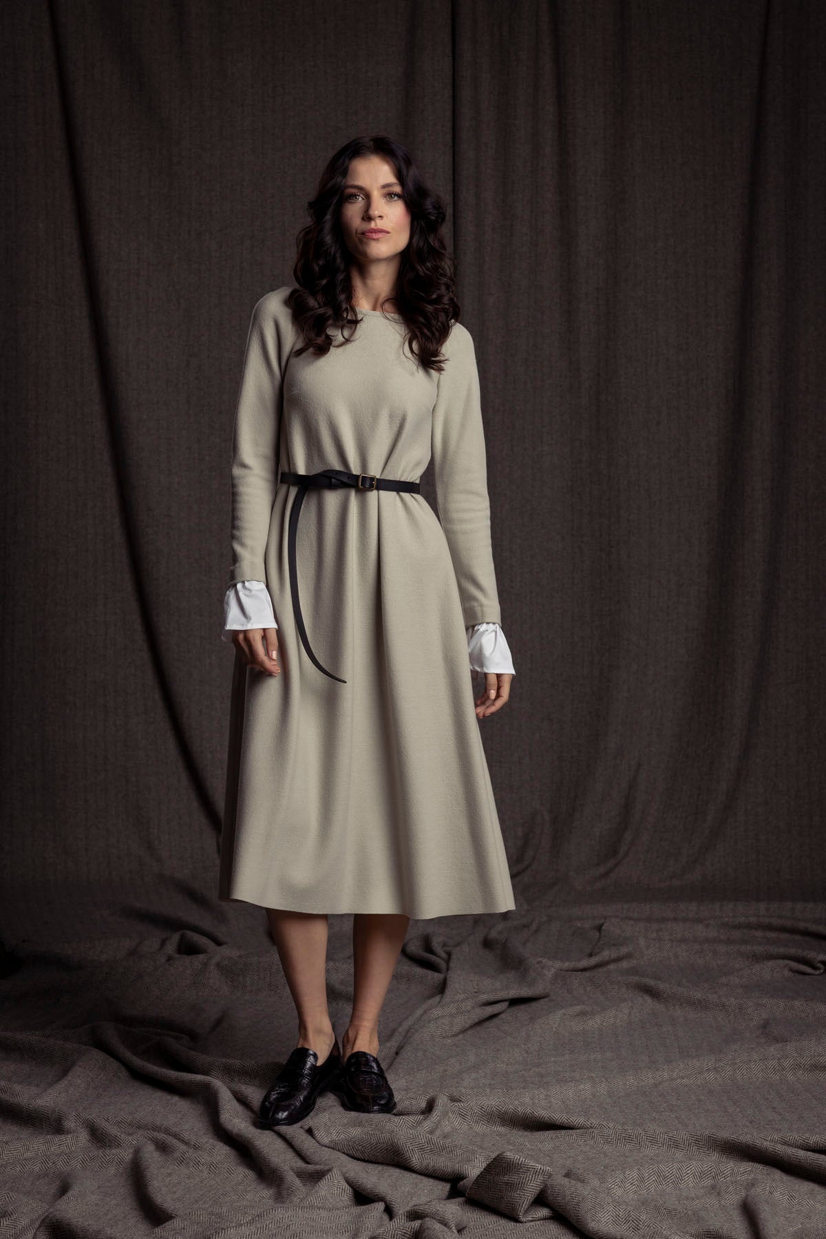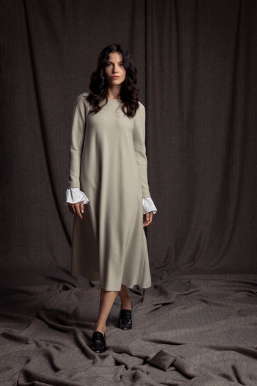 Das elegante Merino-Wollkleid mit Baumwoll-Manschetten ist leicht glockig geschnitten und kann lose oder auch mit Gürtel getragen werden.