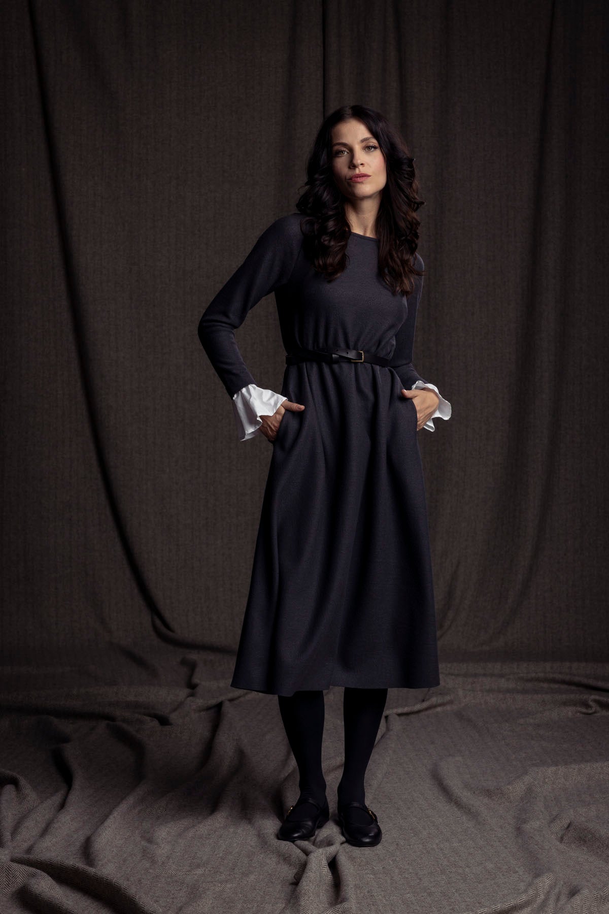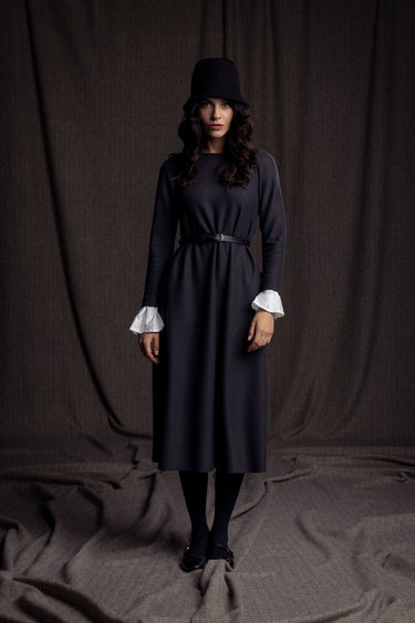 Das elegante Merino-Wollkleid mit Baumwoll-Manschetten ist leicht glockig geschnitten und kann lose oder auch mit Gürtel getragen werden.