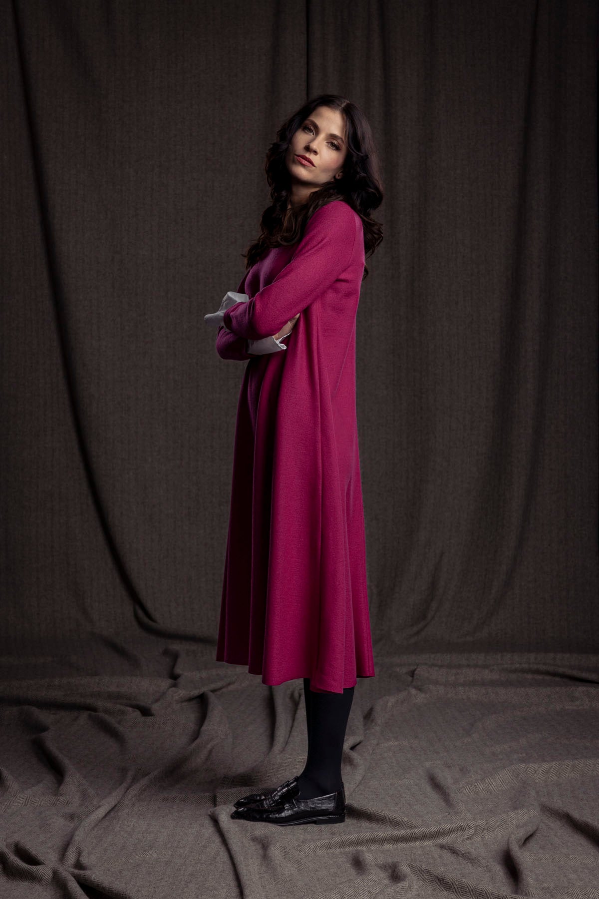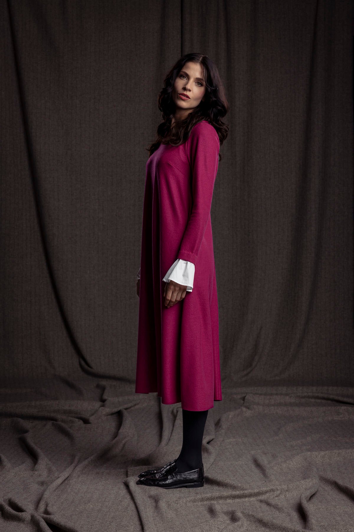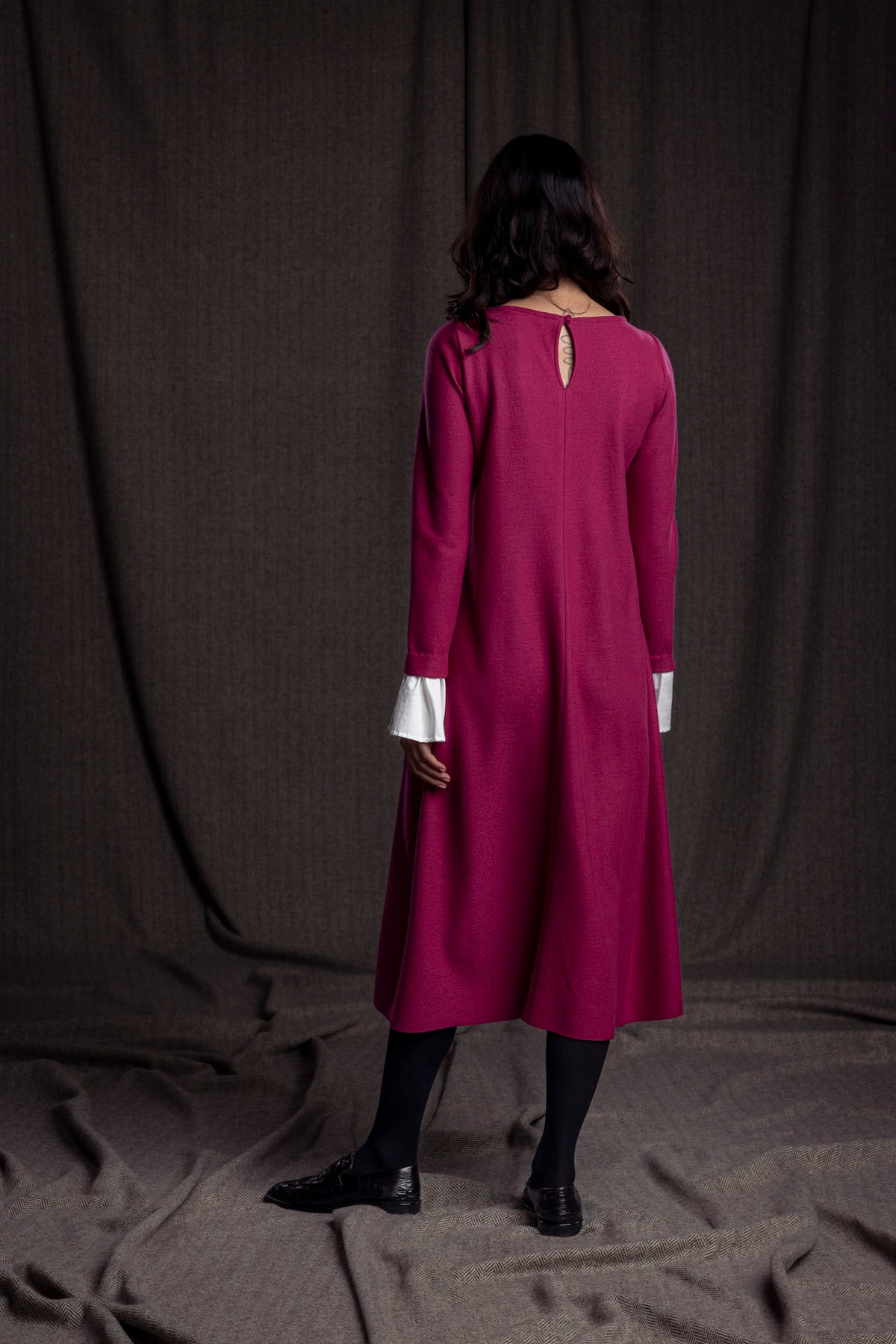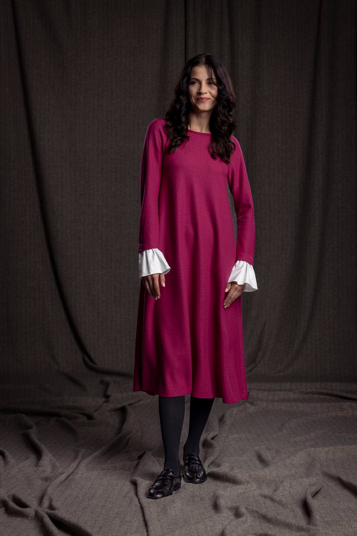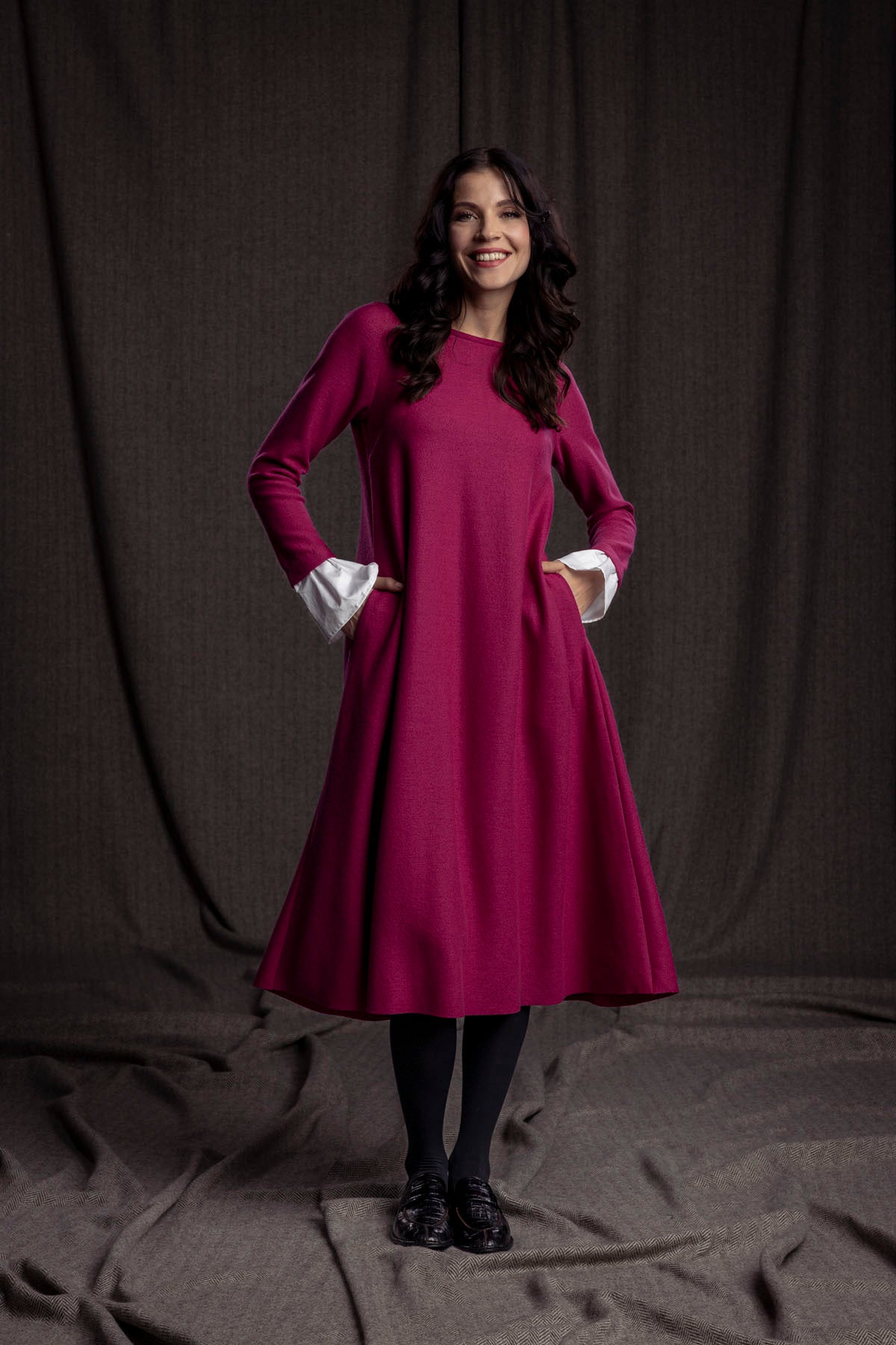 Das elegante Merino-Wollkleid mit Baumwoll-Manschetten ist leicht glockig geschnitten und kann lose oder auch mit Gürtel getragen werden.