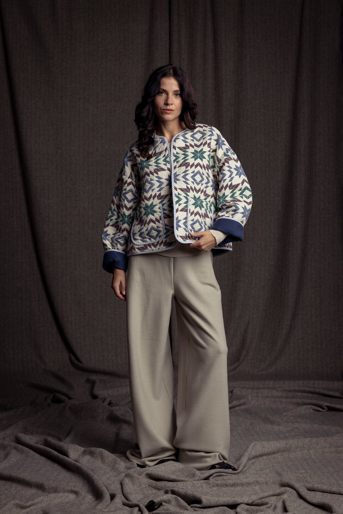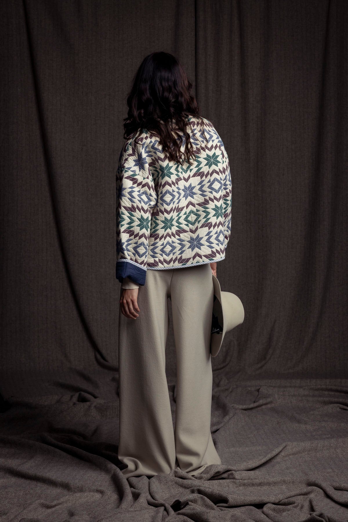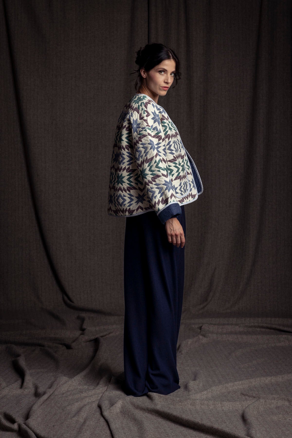Kurze, beidseitig tragbare Wendejacke. Die äussere Seite aus bunt gemustertem Quilt in creme, blau, dunkelgrün und weinrot, ist mit zwei aufgesetzten Taschen besetzt. Geschlossen wird die Jacke mit einem silbernen Haken.