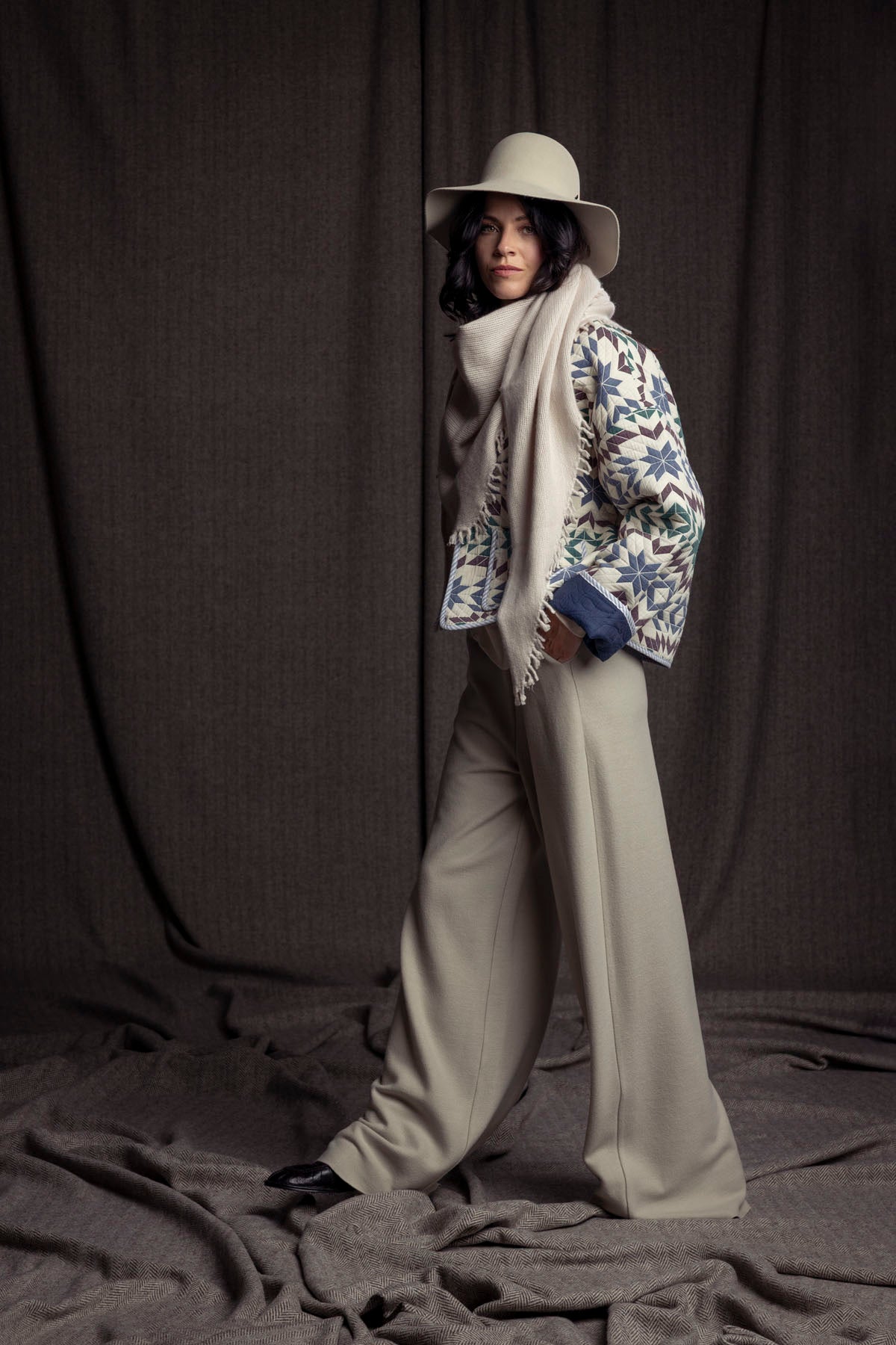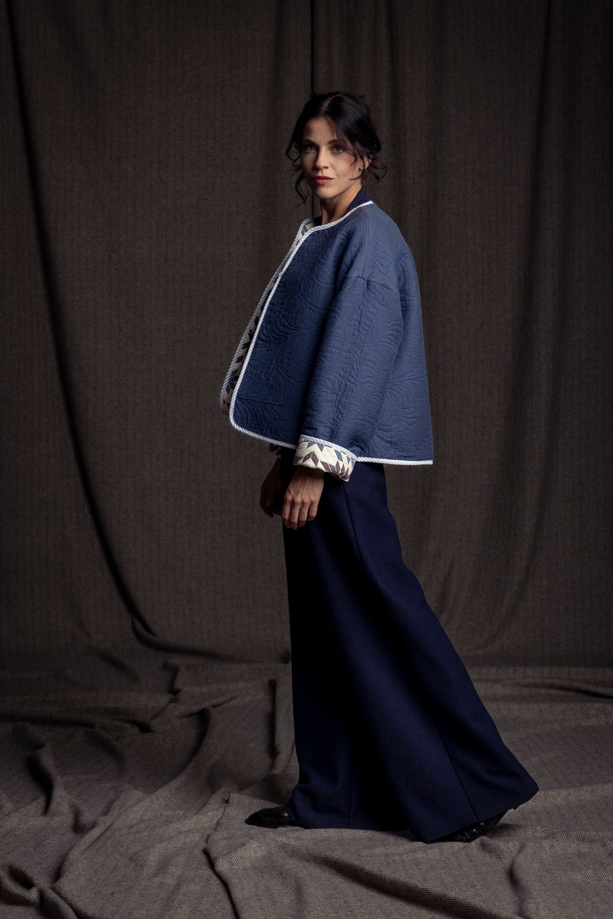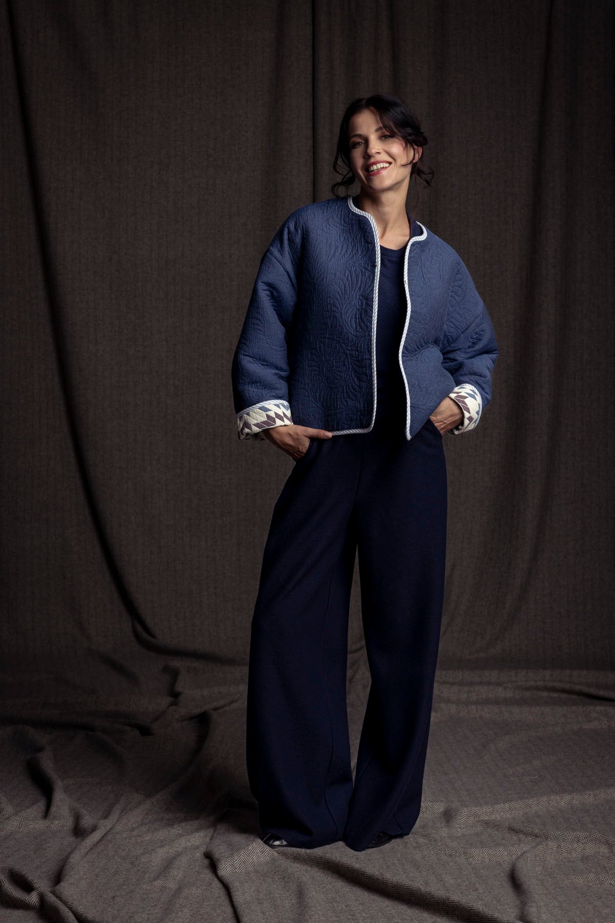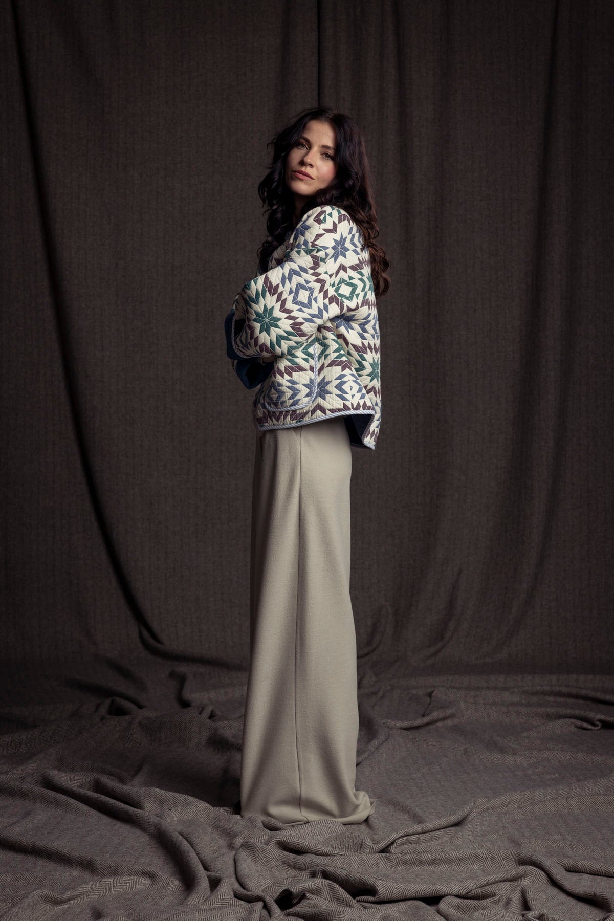 Kurze, beidseitig tragbare Wendejacke. Die äussere Seite aus bunt gemustertem Quilt in creme, blau, dunkelgrün und weinrot, ist mit zwei aufgesetzten Taschen besetzt. Geschlossen wird die Jacke mit einem silbernen Haken.
