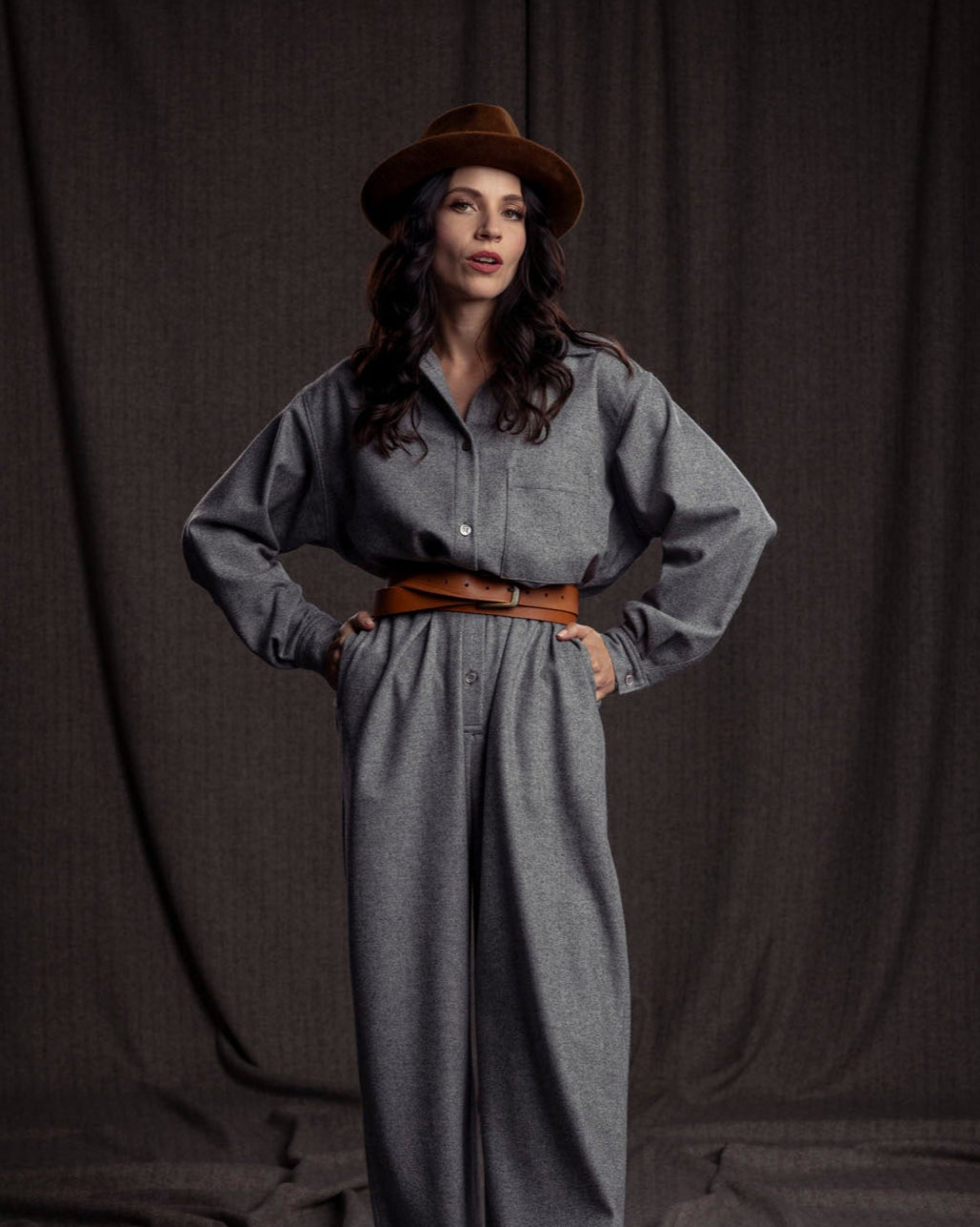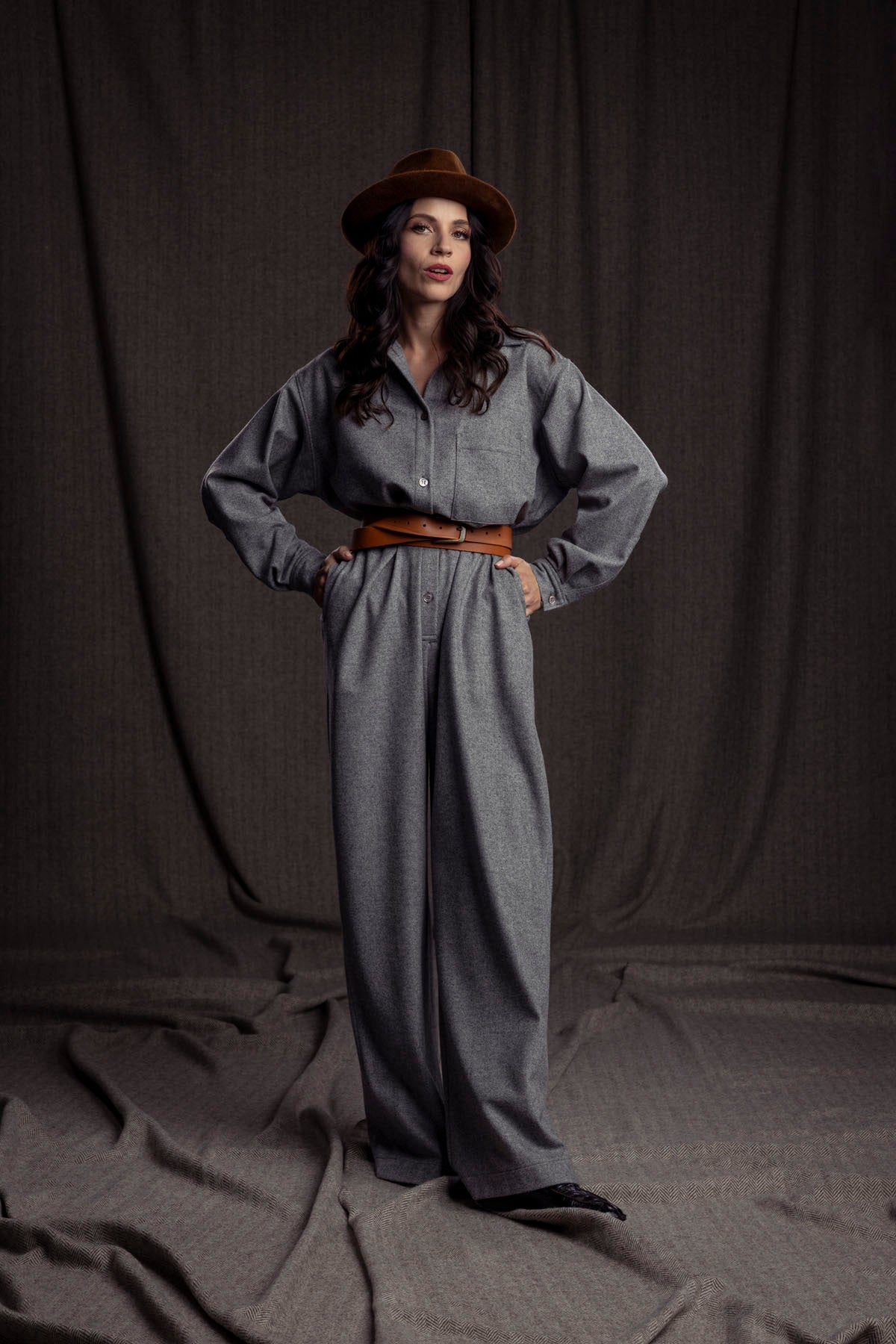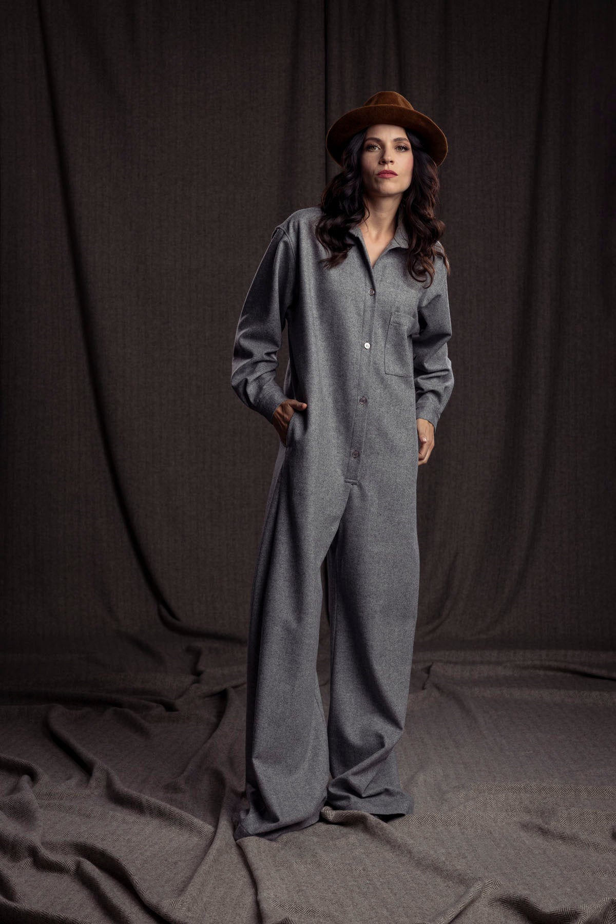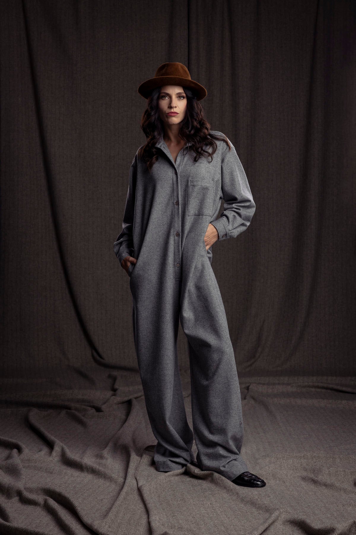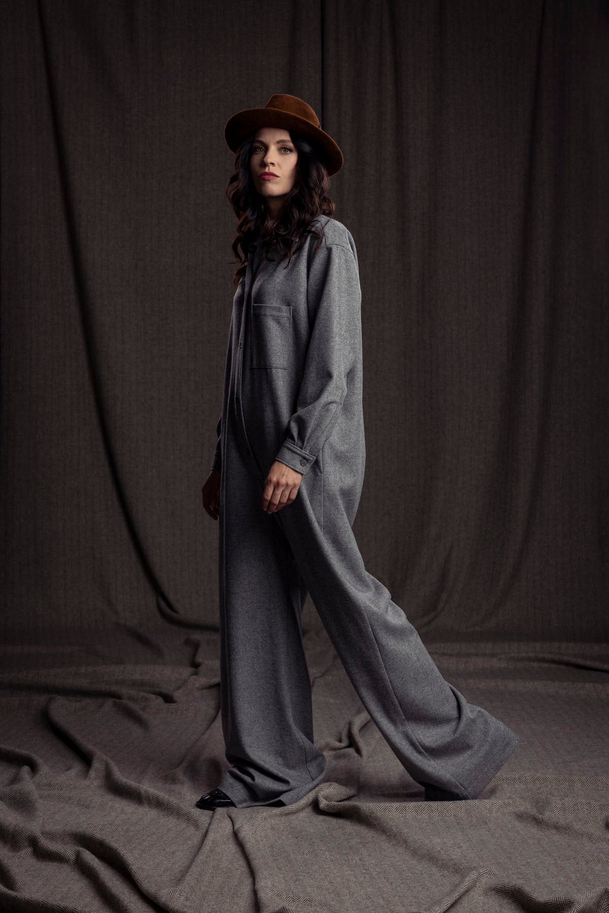 Weit geschnittener Hemdblusen-Overall aus hochwertiger Merinowolle. Der Jumpsuit kann lässig legere oder auch mit Gürtel tailliert getragen werden.