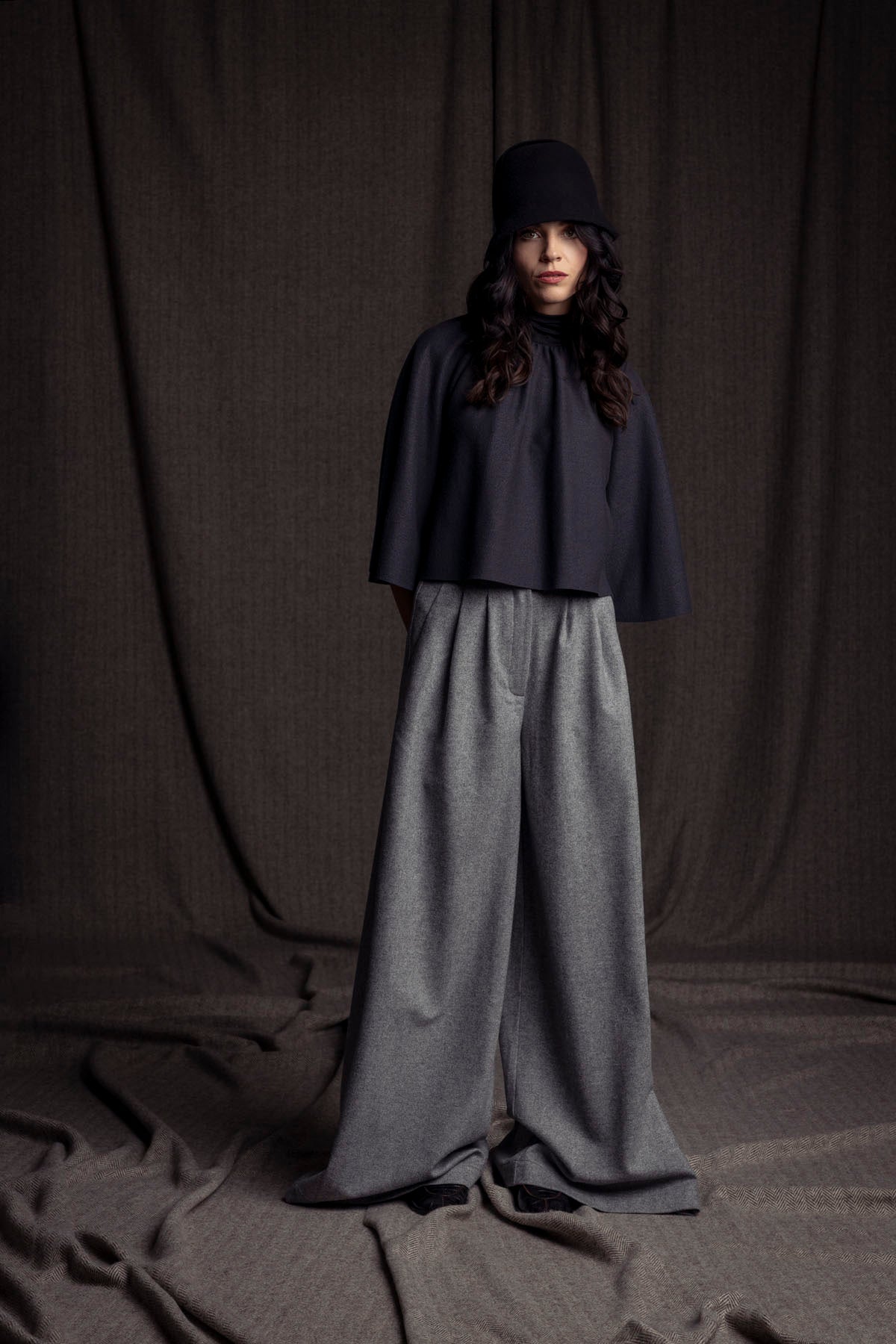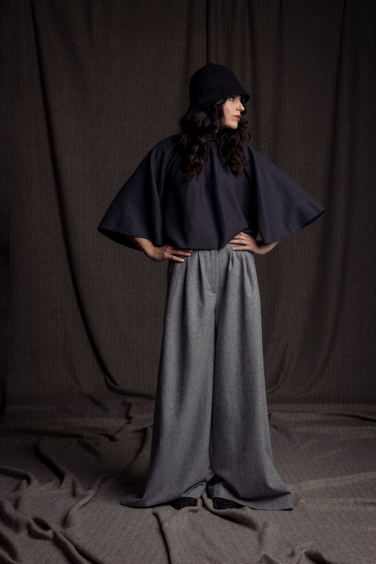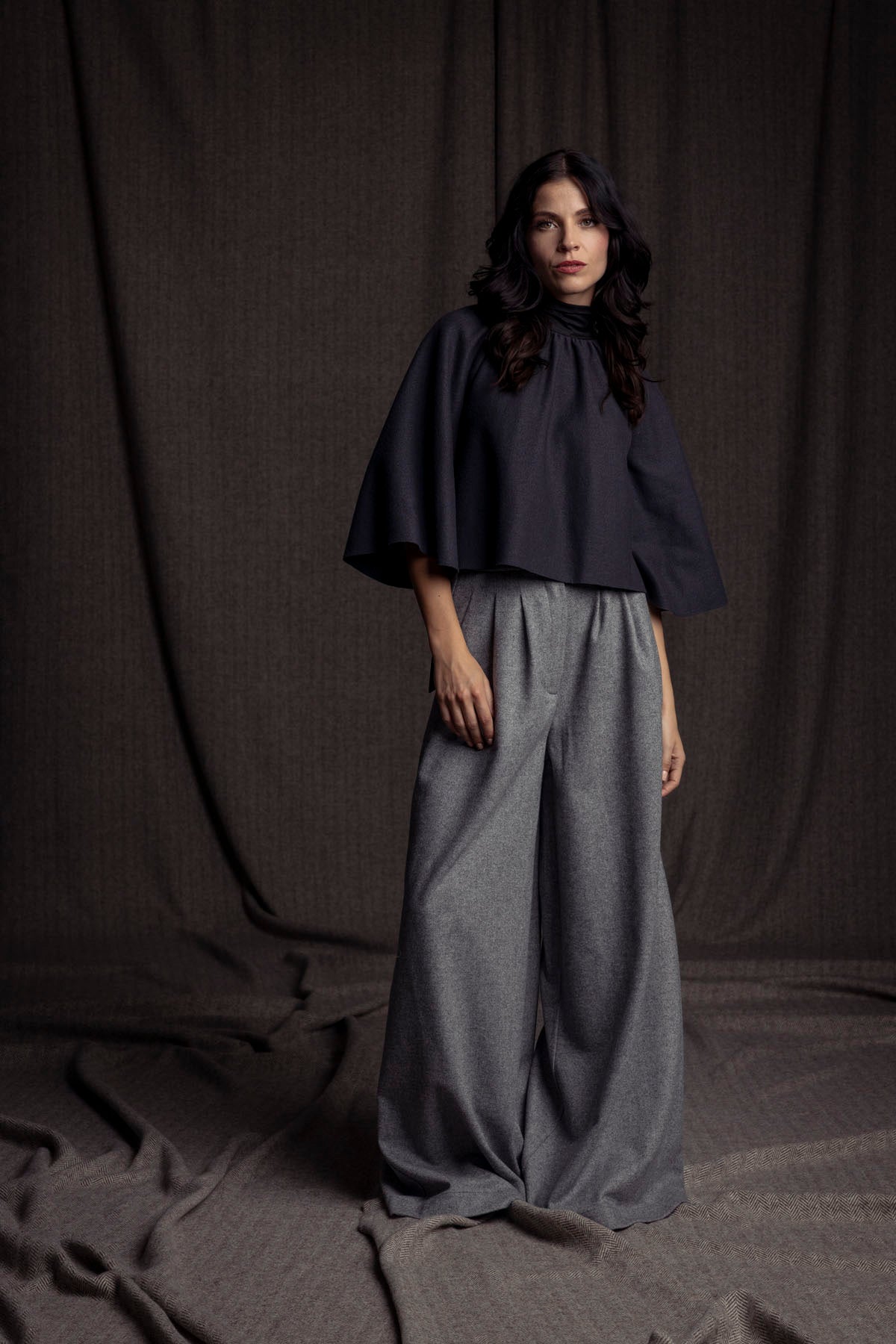 Elegante Wollhose mit extra weitem Hosenbein und schmaler Taille mit Bundfalten.